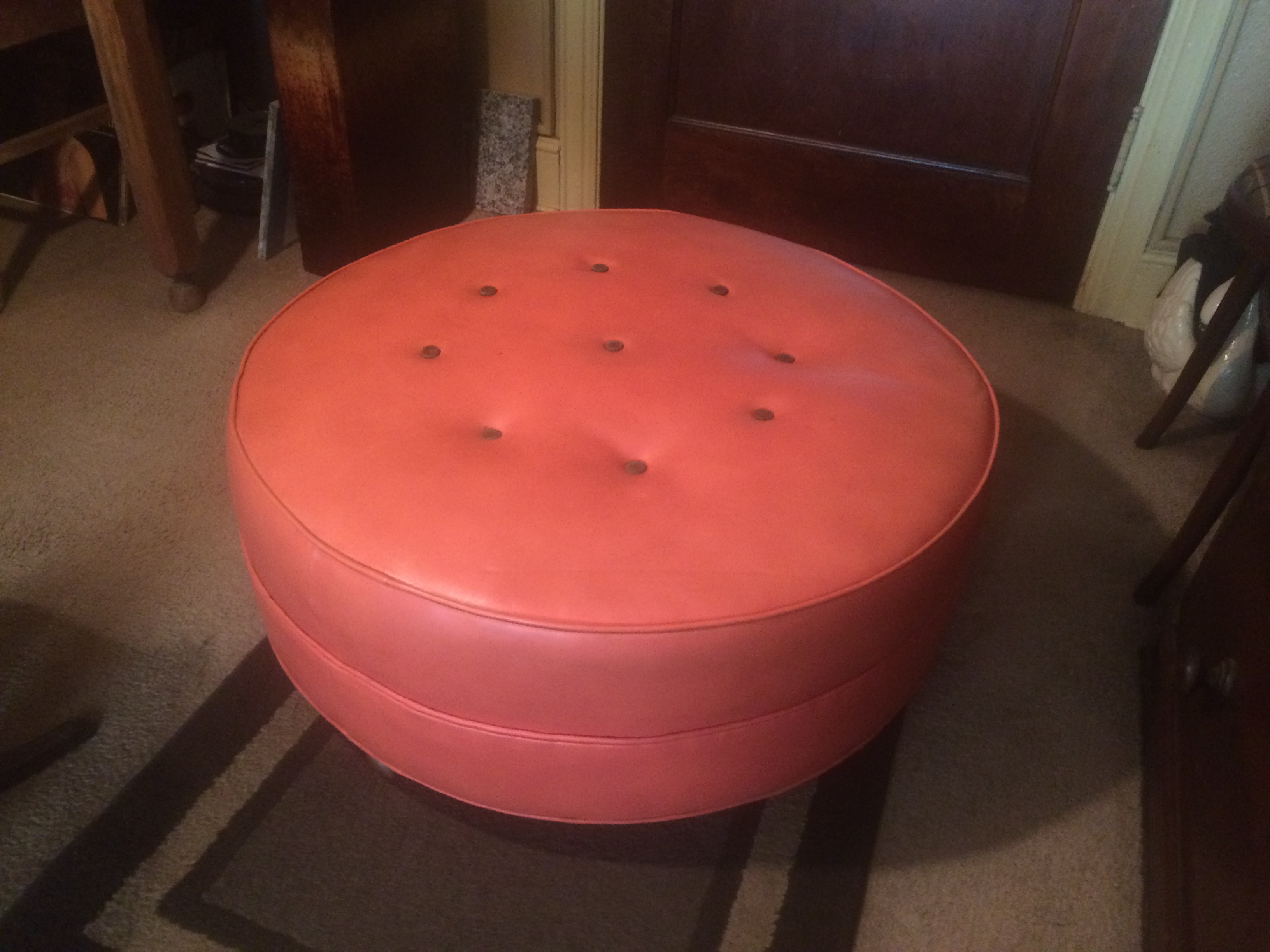 I also remember that when he bought the place, there was one lone piece of furniture left in one of the bedrooms. A beautiful, heavy round ottoman upholstered in coral naugahyde. On casters. From Marshall Field’s…probably made in the late ’50’s or early ’60’s. “Make sure you get to keep the ottoman when you sign the deal,” I insisted. It was going to be perfect in my retro-themed apartment. It was a true find–one of those things that if you had set out to find it, you probably couldn’t. It was a delightful classic piece to sit in front of my sofa and serve as a cocktail table and leg rest. What a great color, I thought, to sit on my cream and black zebra-print rug. It was one more wonderful, unique element to add to the slow, gradual upgrade of my apartment during the transition years. I loved it.